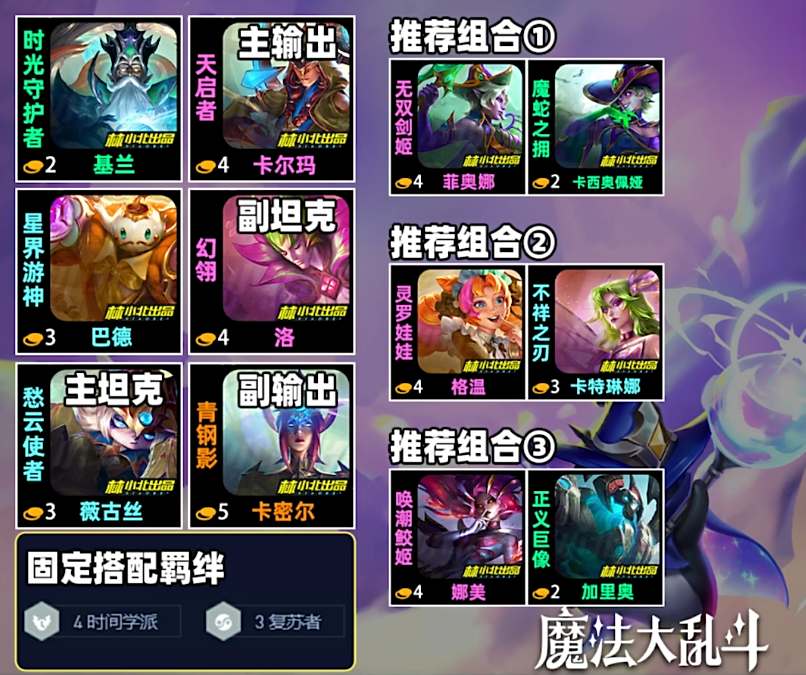 固定的羁绊是4时间学派3复苏者。剩余的羁绊根据弈子的配置来激活,可以开狂暴战士、法师或者术士。