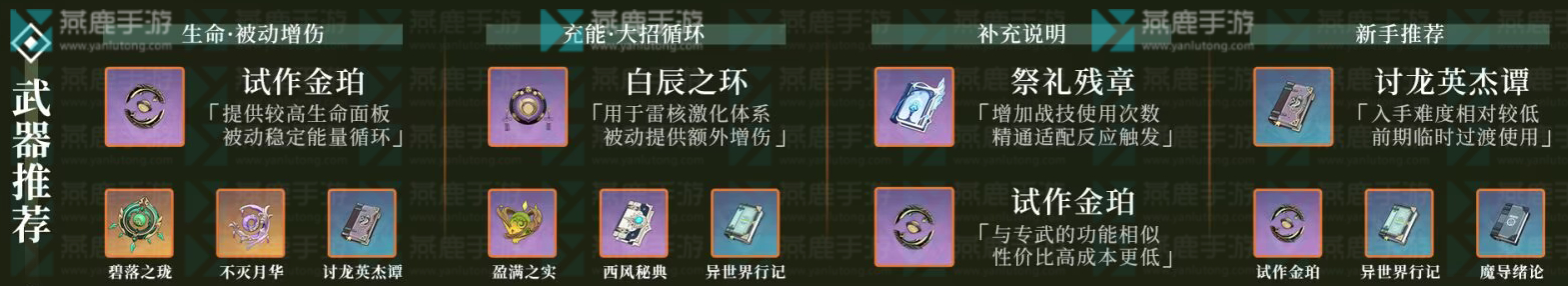 西风秘典:有好的生命沙前提下可以考虑循环向武器。提升元素充能效率,降低全队充能压力。