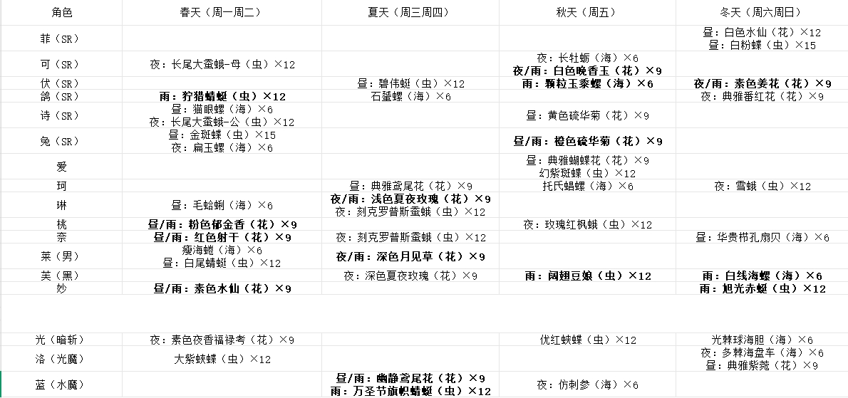 本篇为大家分享开放空间中全部角色突破时需要用到的季节限时材料汇总,表格会按照春夏秋冬的分别来记录每一位角色的季节限定材料,方便大家收集。