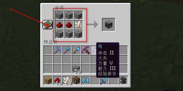 1、首先先去收集圆石6个,红石粉2个,下届石英1个,然后再进入游戏的工作台那里;