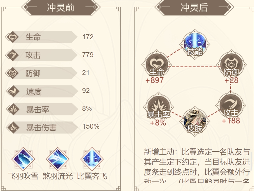 当比翼与某一队友绑定后,青鸟可以使得这么队友立即行动,从而比翼也能额外获得一次行动。比翼每多绑定一次关系,就能多一次的行动回合。