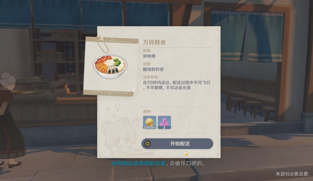 任务要求:在70秒内送达,配送过程中不可飞行,不可攀爬,不可沾染元素。
