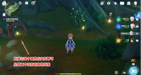 7、打败破坏花圃的隙境原体后与柯莎对话,之后在附近寻找线索,线索共有3处直接与图示位置的调查点交互即可。
