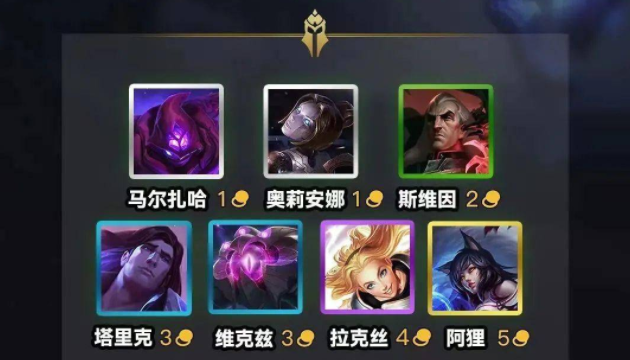 1、羁绊弈子:玛尔扎哈,奥莉安娜,斯维因,塔里克,维克兹,拉克丝,阿狸