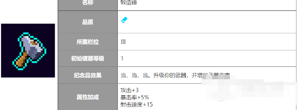 4、最后一个道具是锻造锤,道具效果可以升级我们的武器并增加伤害,可谓是非常厉害的武器了。