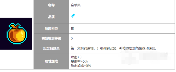 1、第一个给武器升级的道具叫做金苹果,效果为升级我们的武器并增加角色的移动速度,这个道具较容易获得。
