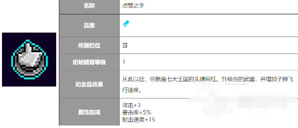 3、第三个道具是点赞之手,这个道具的效果是升级武器并增加武器射速,也是比较好获得的。
