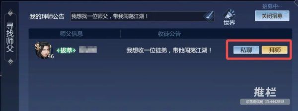师徒系统中,玩家可以寻找合适自己的师傅进行拜师,也可以帮助玩家进行收徒。