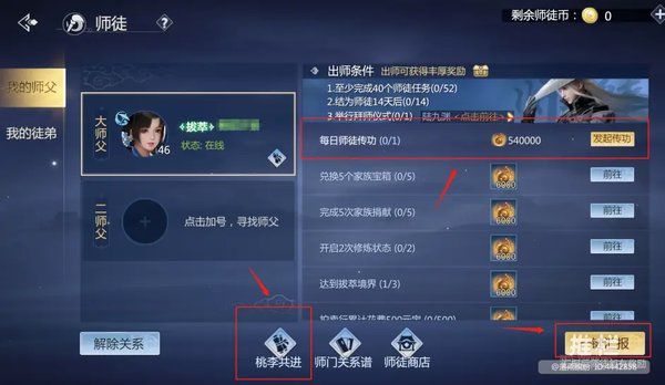拜师后天天都能师徒传功,并且每周还有师徒任务,我们完成出师任务即可获得获取大量经验,师徒每天1次,我们还可以进行家族传功每天2至4次不等。