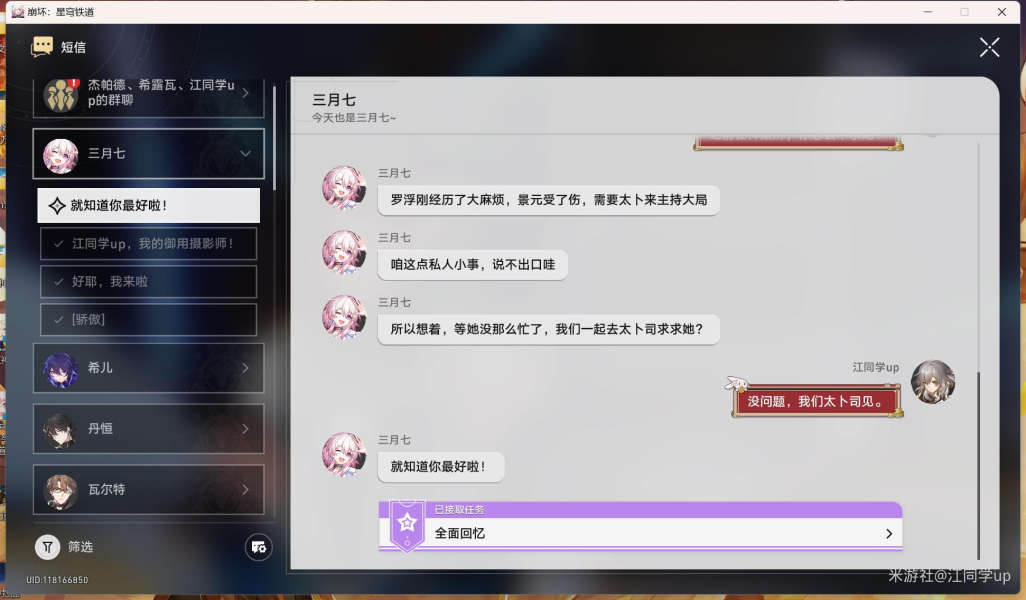 1、首先先通过三月七的短信领取全面回忆任务;