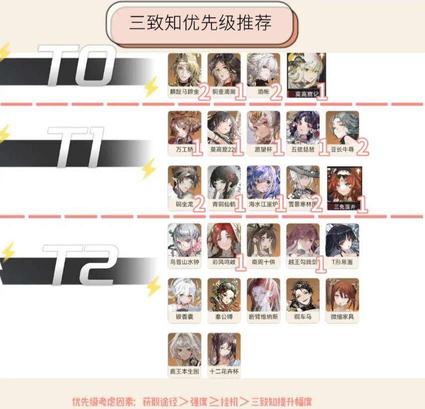 本篇为一家分享的是物华弥新2.0版本的全部器者三致知强度分析及提升优先度,三致知往往能让一个角色到达完全体状态,只是想要提升还得看材料,在材料不足的情况下就只能进行取舍了。