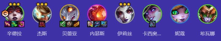 辛德拉、杰斯、贝蕾亚、内瑟斯、伊莉丝、卡西奥佩娅、妮蔻、希瓦娜