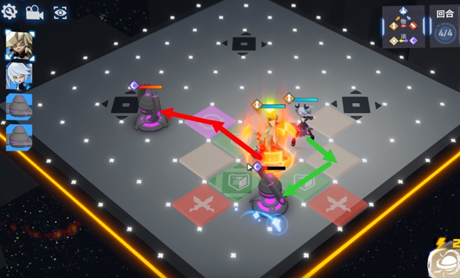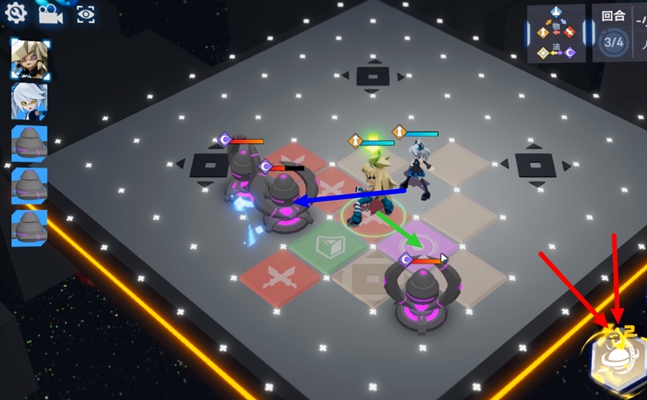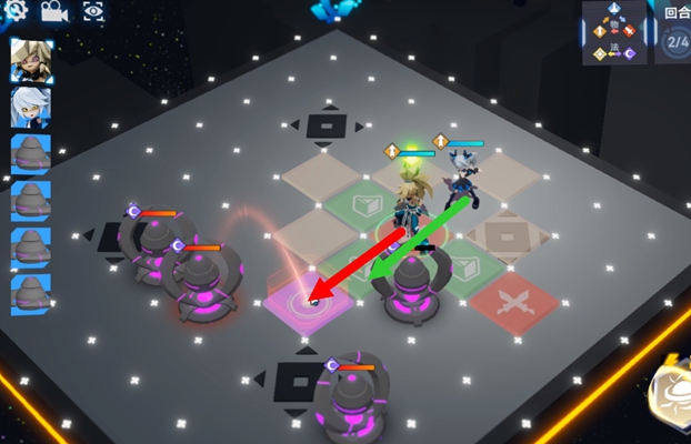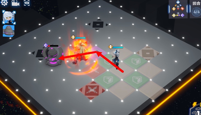 4、然后佩利到上方紫色格子处攻击敌人,远程输出开一技能往右移动一格到紫色位置上收到残血小怪。