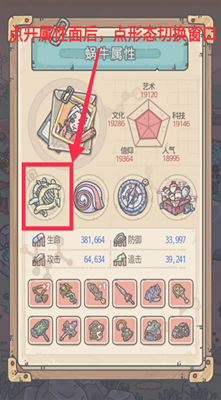 1、点击蜗牛的属性面板,点击形态切换按钮,切换至蜗牛形态面板。
