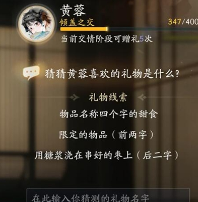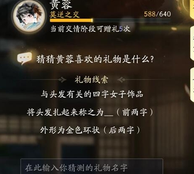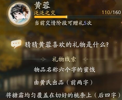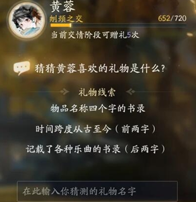 以上就是射雕手游黄蓉喜欢的礼物一览,玩家可在游戏中根据线索来进行猜取礼物名称。