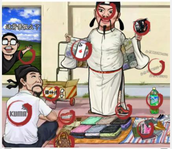 1、关卡中的假货:樱桃手机、背景、唱片、杜甫的T恤、雷碧、唐诗七百首、LU包、糠师傅、球鞋、证件、假牙、李白的假睫毛。