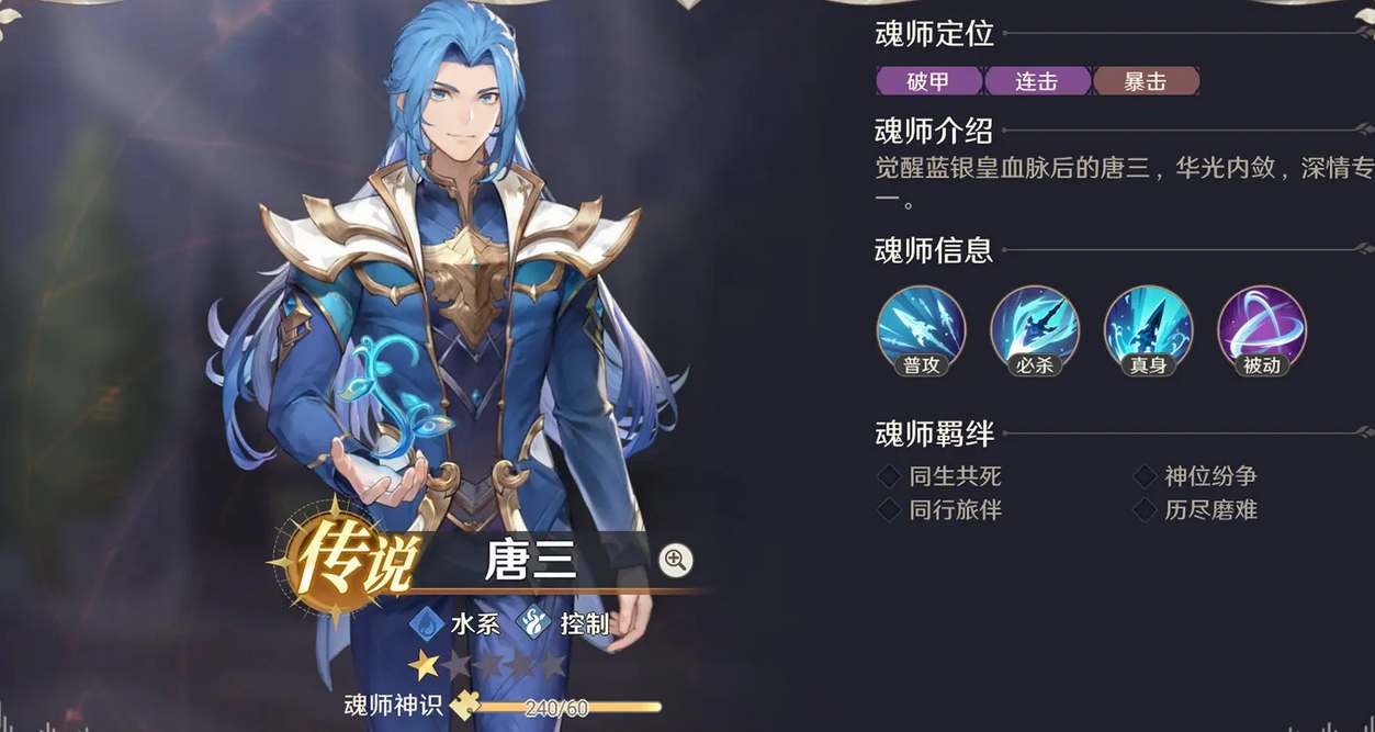 唐三:目前游戏中的最强输出核心,武魂真身下可大幅提升暴击率,必杀在造成暴击时可吸取目标武魂值。这个角色比较吃练度,推荐优先培养。
