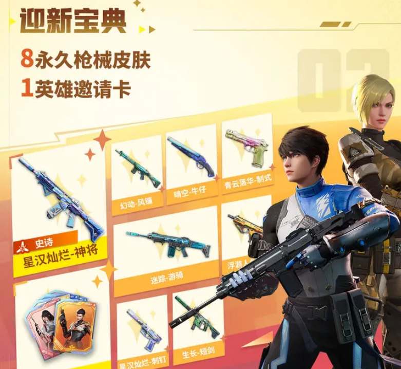 5、迎新宝典,可累计领取8款永久武器皮肤以及1英雄邀请卡。