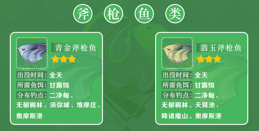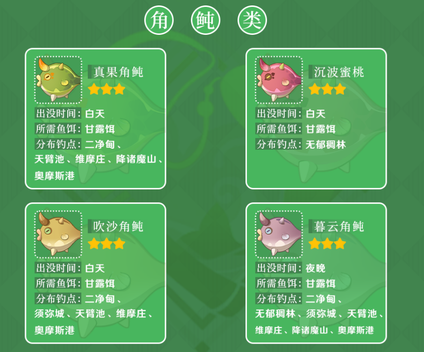 鱼类:沉波蜜桃(白天)、暮云角鲀、青金斧枪鱼、翡玉斧枪鱼。