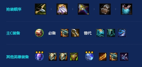 优先图奇装备,其次前排肉装。由于5迅捷射手的加成,图奇并不刚需羊刀,转而做三输出能更快打出爆发,有神器狙击手的专注的话上限会更高,对面控多则第三件做水银。韦鲁斯如果三星不了,就把装备拆给2星霞