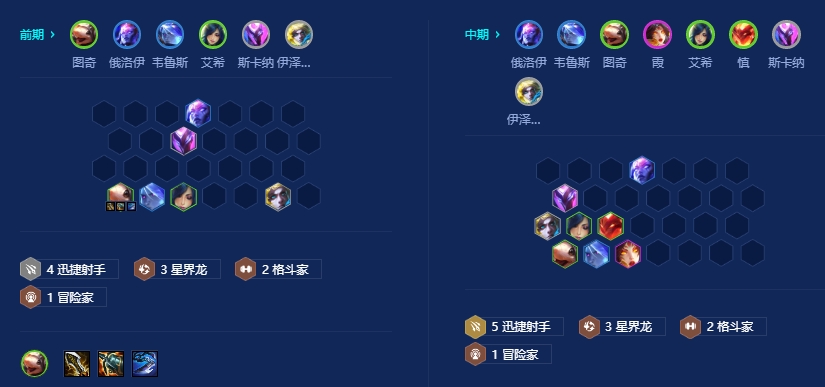 前期开3迅捷射手搭配3星界龙过渡,因为星界龙羁绊效果,俄洛依和斯卡纳比较容易2星,能顶得住前排。3-2升6图奇三星后再拉等级,补齐阵容。如果上不去9,可以龙神之路选择收100层的冠冕奖励把阵容补齐。如果韦鲁斯没办法三星,则用2星霞去做副C