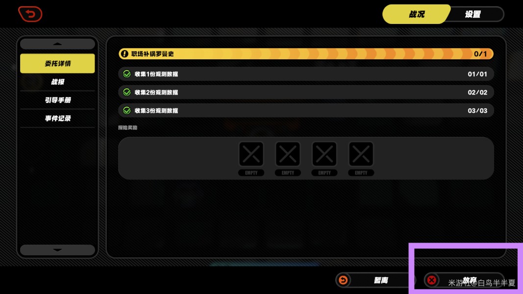 非首次通关的话,拿到奖励后,点击左上角放弃挑战,未完成挑战也可以拿到奖励(观测数据,小卡格车等均适用)。