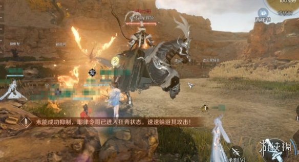 耶律令哥环绕地图奔跑,对玩家释放远程攻击,并且进入20秒的狂奔倒计时,需要使用套马绳道具进行控制(领主身上的细线就是成功牵引)。