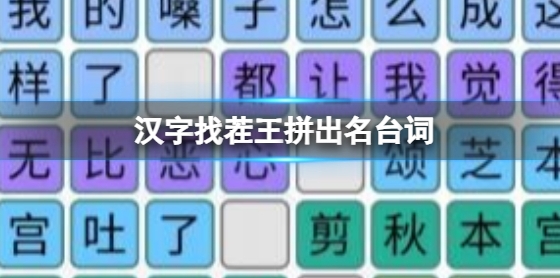 以上就是汉字找茬王中拼出名台词的具体通关玩法了,玩家根据上面的操作就能够轻松地通过关卡了,并且在操作的时候需要注意剩下的时间,速度要快,不然的话可能会超时喔,时间为0的时候,挑战也会失败。