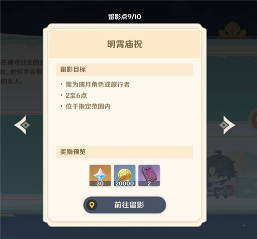 本篇为大家带来的是原神提瓦特忆画雪幕前事活动第五天的留影点明霄庙祝和飞羽汇翼的位置,在完成前置任务拿到派蒙的留影机后就可以去做任务了,不过需要先装备到道具栏,派蒙的留影机在背包的小道具页面里。
