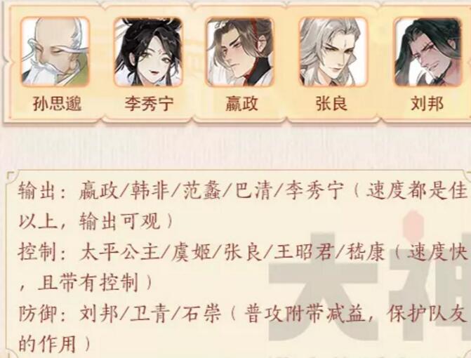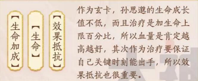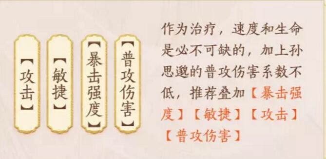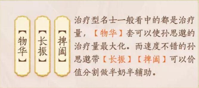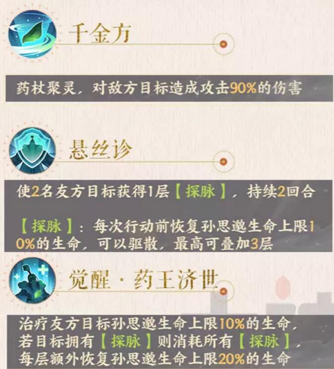 孙思邈的特点是治疗持续稳定,但是治疗条件需要友方行动以后才能恢复,所以一般搭配整体速度快点的阵容,速度较快的一般是控制,群体输出和辅助。孙思邈作为治疗适用于任何场景。