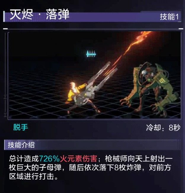 2、灭烬·落弹,范围伤害,伤害较高,多用于清小怪。