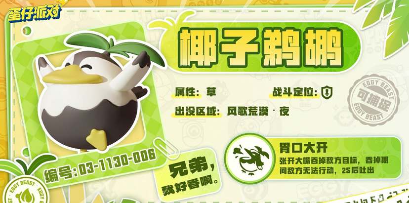 椰子鹈鹕是草属性的战斗艾比,专属技能胃口大开,吞掉敌人后2s后吐出,被吞食的敌人在期间将无法行动。