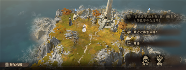 然后回到白塔,找到npc赫尔弗姆,赠送好感度满了以后,跟他对话可以获得一件金色头部或者武器的材料