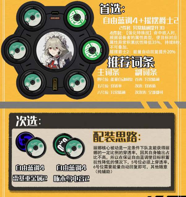 驱动盘主词条4号位选择能量自动回复,5号位优先选择穿透率,6号位推荐选择异常精通。