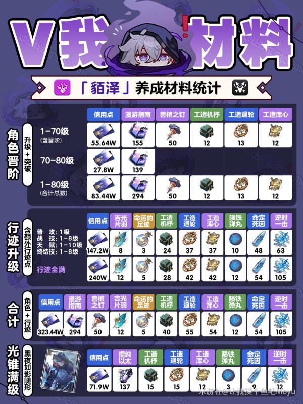 普攻1级/战技8级/天赋10级/终结技8级(含所有额外行迹材料)
