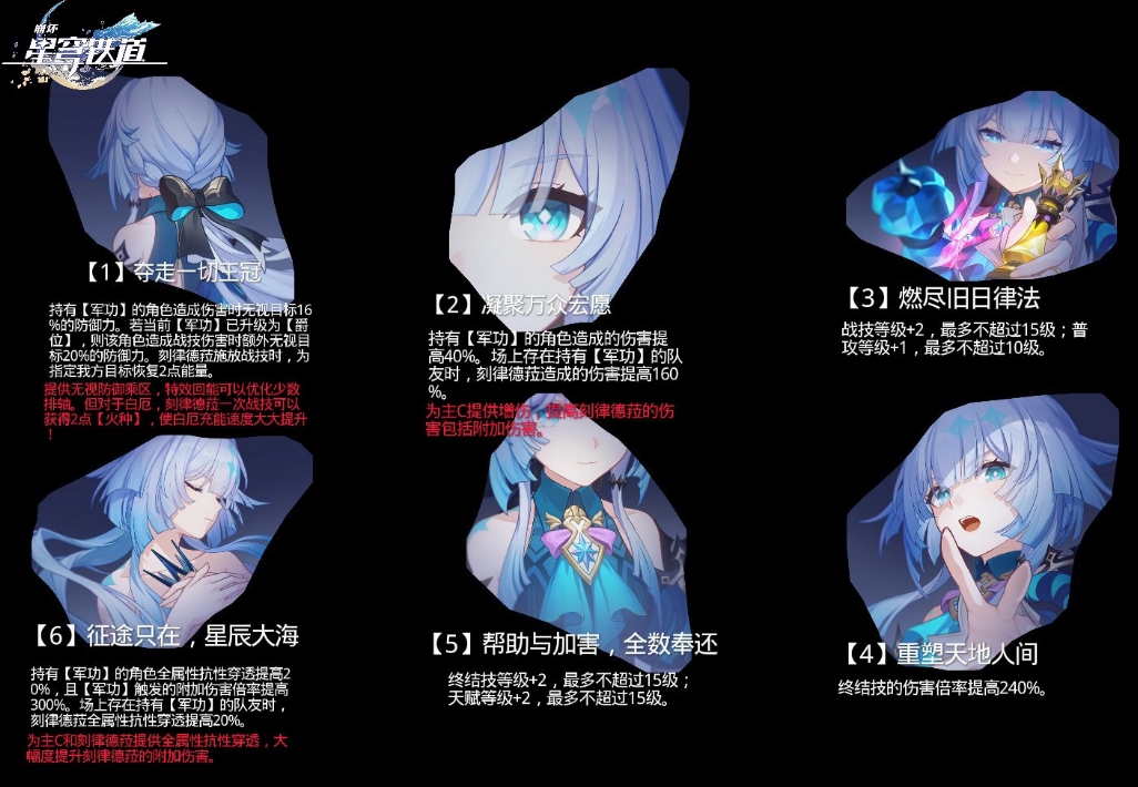持有【军功】的角色造成伤害时无视目标16%的防御力。若当前【军功】已升级为【爵位】,则该角色造成战技伤害时额外无视目标20%的防御力。刻律德菈施放战技时,为指定我方目标恢复2点能量。