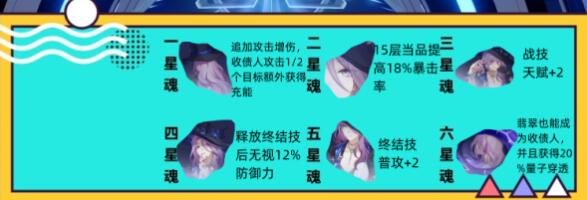 翡翠的星魂数值给的比较保守,因为翡翠是对群角色,一点增益都是要翻五倍来看的,智识角色给的数值都是很谨慎的。一星魂是对单补偿,二星魂加暴击率,能够稳定触发,四星魂12%减防,满星魂翡翠加量子穿透,并且也能享受到自己的增幅。