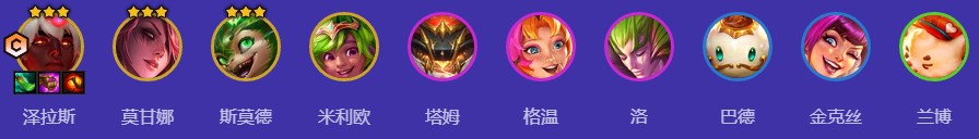 泽拉斯、莫甘娜、斯莫德、米利欧、塔姆、格温、洛、巴德、金克丝、兰博