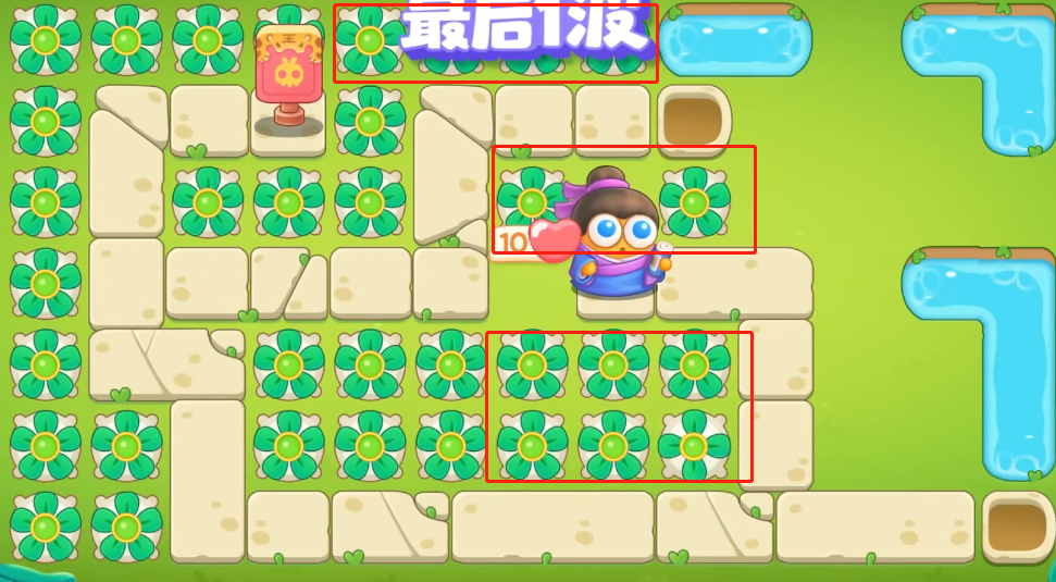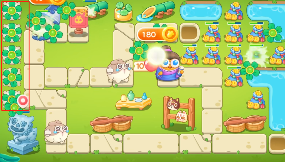 4、钱攒够了先在中间铺满炮塔,上方也补充一个,右边也建造一个炮塔来打钱袋。