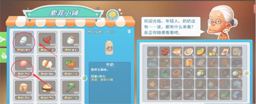 3、再去索菲小铺里购买鸡蛋和牛奶,合成水果蛋挞得要有烹饪锅,我们要提前组装一个烹饪锅。