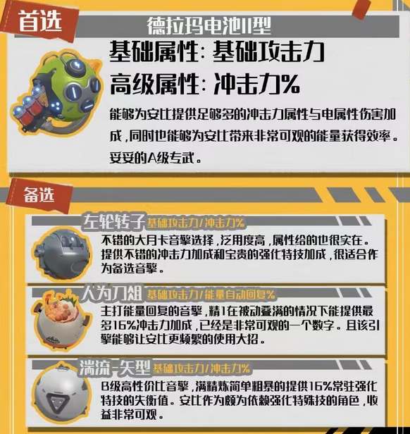 四星专属音擎【德玛拉电池II型】是最优的选择,可以提供攻击力和冲击力加成,还可以提升回能效率,是安比的专属音擎。