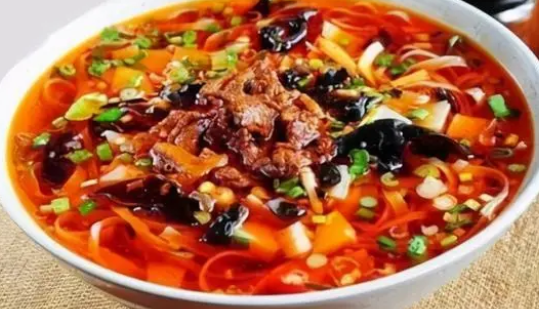 臊子面是陕西标志性的美食,它发源于西府,也就是陕西宝鸡岐山,它的味道以酸香为主,配料十分讲究,黄色的鸡蛋皮、黑色的木耳、红色的胡萝卜、绿色的蒜苗、白色的豆腐等材料,既好看又好吃。