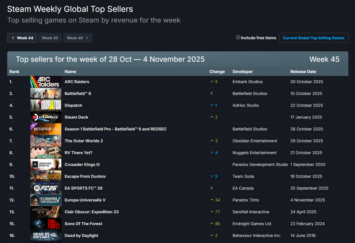 Steam最新一周全球销量榜单(2025年10月28日-2025年11月4日)正式公布,最近人气飙升的合作射击游戏《ARC Raiders》成功登顶榜首。