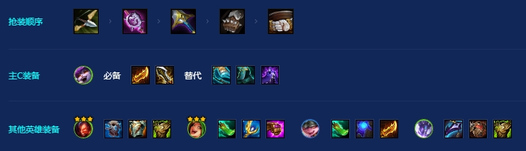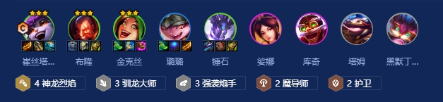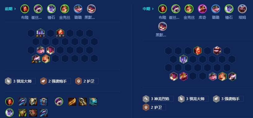 前期驯龙搭配炮手过渡,中期拉人口补齐质量即可。大后期黑默丁格可以换巴德或索拉卡
