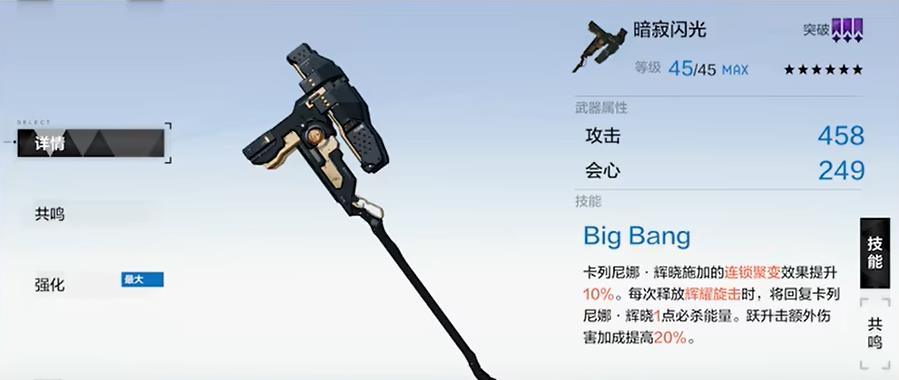 3、武器搭配推荐:六星专武暗寂闪光(连锁聚变效果提升10%每次释放辉耀旋击,将回复1点必杀能力,跃升击额外伤害加成提高20%);