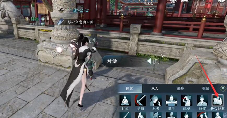 1、我们打开地图来到此处,找到npc㑈雀儿跟她互通,采用动作探索栏里,然后选择开心鼓掌开启奇遇。