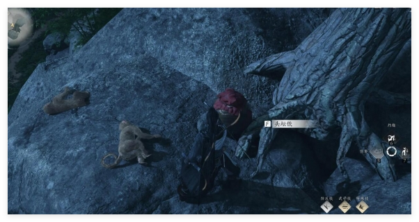 3、然后就可以去花海右侧山泉附近的石头上就可以发现头坛酒的线索,附近的话就可以看到有躺着几只猴子;