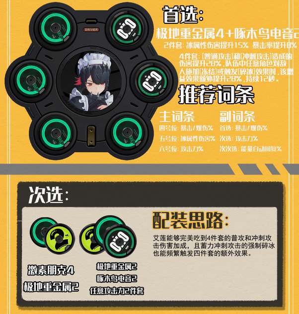 驱动盘主词条4号位暴击或爆伤宝粉笔,5号位推荐冰属性伤害百分比,6号位推荐攻击力百分比。