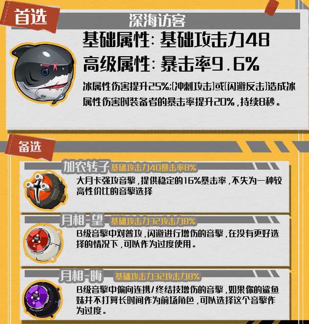 五星专属音擎【深海访客】,面板攻击力和暴击加成。强化效果进一步提升冰伤和暴击,可以让艾莲乔在实战中打出更高的伤害。