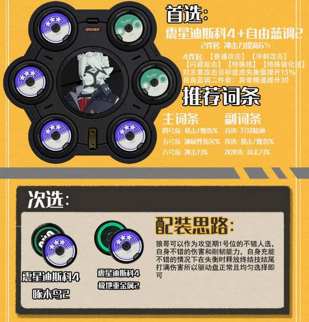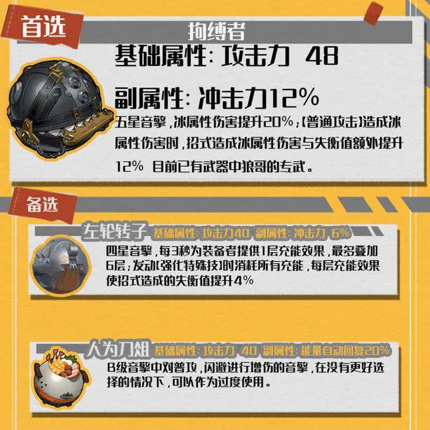 最优选择是五星【拘缚者】,提升冰属性伤害,并且可以额外附加失衡值,在当前版本算是狼哥的专武。